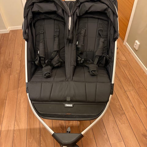 Dubbelvagn ifrån Thule som är inköpt för cirka ett år sedan och använd varsamt i cirka nio månader. Det ingår en liggdel samt adaptrar till Maxi Cosi babyskydd samt ett oanvänt regnskydd till dubbelvagn och ett regnskydd till liggdelen. Vagnen är perfekt till både promenader och löpning.