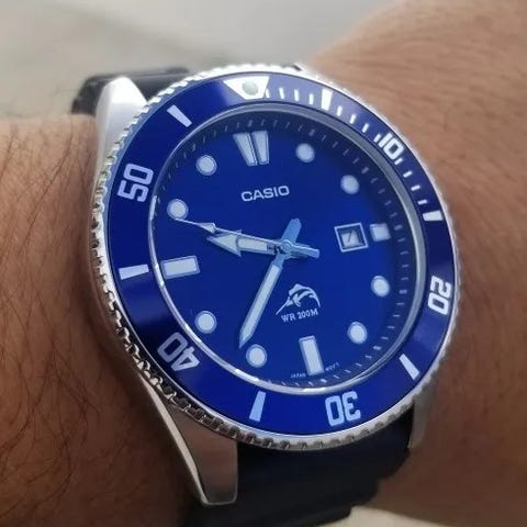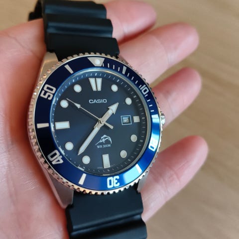 Casio Duro svart stål MDV-10D-1A1VEF armbandsur är en älskad remake av Casios klassiska dykarklocka, Marlin. Även om Casio sedan dess har släppt marlindesignen, har den nydesignade Casio Duro svart stål MDV-10D-1A1VEF samma eleganta dykarklocksutseende, vilket gör den lätt att sätta på handleden. MDV-10-klockans avsmalnande bezel på 38,5 mm rymmer en elegant svart sunray-urtavla med en datum, och urtavlan flankeras av en enkelriktad roterande bezel med en aluminiuminsats. Eftersom klockan har en smalare boett är urtavlan behagligt kompakt, och de något upphöjda indexen ger utmärkt läsbarhet från alla vinklar. I svaga ljusförhållanden förbättras läsbarheten av den neongröna luminering. Casio Duro dykarklocka MDV-10D-1A1VEF i svart stål har ett silverfärgat stålarmband, som är 16 mm i bredd vid spänne, och lätt rundade bezeler som gör att den sitter bekvämt på handleden.