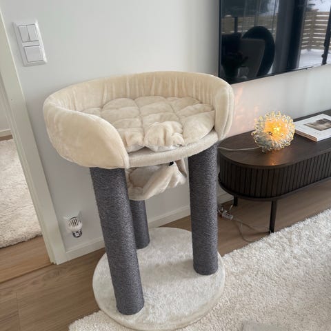 Mjukt kattbädd med klösställning och matskålar