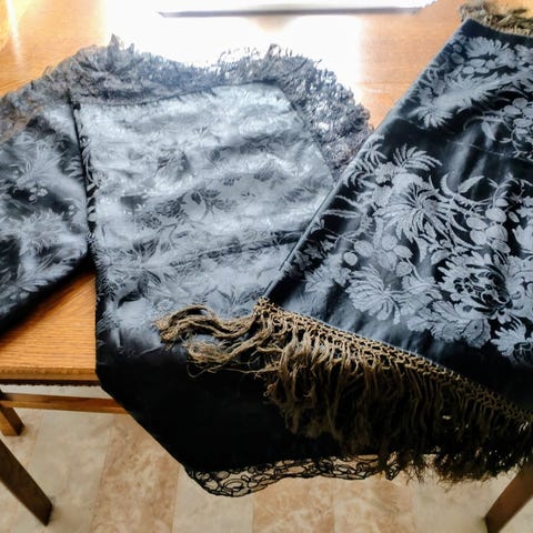 Två silkiga, tunna, bruna/guldskimrande sjalar med spännande mönster och lyxig känsla