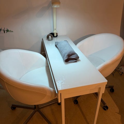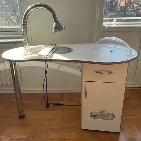 Jag säljer nu mitt nagelbord med inbyggd fläkt, då det inte används längre. Jag har också en uvlampa och elektrisk nagelfil med två olika bitsar. Allt ingår, dock inte stolarna på bilden.