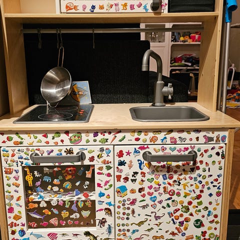 IKEA barnleksak kök i trä med spis, ugn, vask och förvaringsutrymme. Kökets färg är huvudsakligen ljusbrun med svarta detaljer. Lämplig för barn att leka och öva på köksaktiviteter. Kommer även med leksaksservis mm