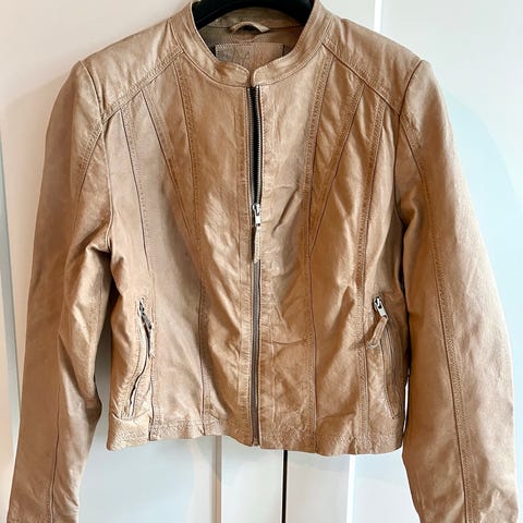 Mycket fräsch kittfärgad mockajacka från Jofama Rookie by Kristine Ullebö. Jackan har dragkedjor framtill och detaljerade sömmar på axlarna. Insidan har ett jättefint mönstrat foder. Storlek 44 men är ganska liten i storleken.