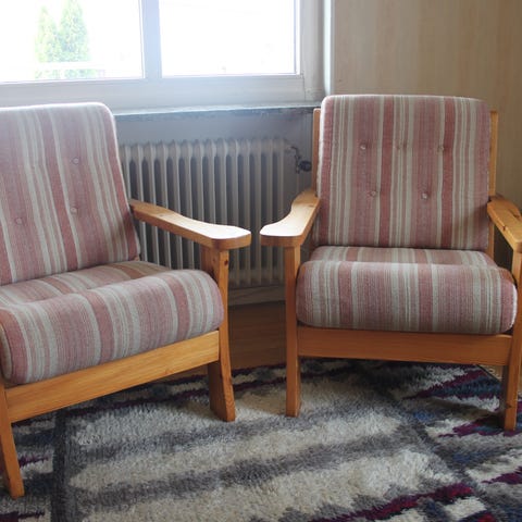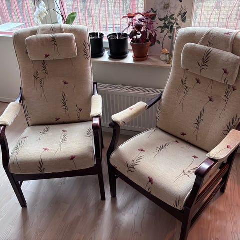 Fåtöljer i trä med mönstrat tyg i röd och beige ton. Har hög rygg och vadderade armstöd. Passar för vardagsrum eller läshörna. Designen är traditionell med fokus på komfort.