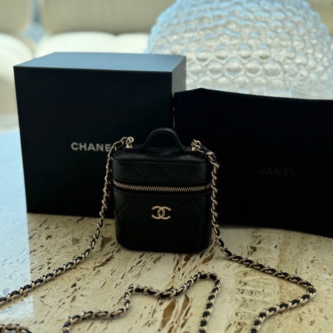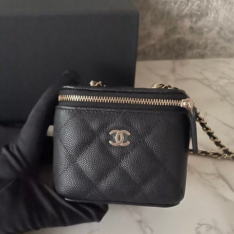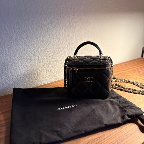 Chanel Vanity Bag i vinröd färg. Väskan har en quiltad design och en kedja i guldton. Insidan innehåller flera fack och en spegel. Väskan är kompakt och lämplig för mindre tillhörigheter.