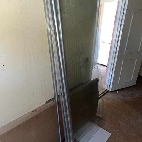 Duschvägg från Camargue i härdat säkerhetsglas med svarta profiler. Finns urkapade hål på botten av profilerna för rör. Mått ca 195 x 70 cm.