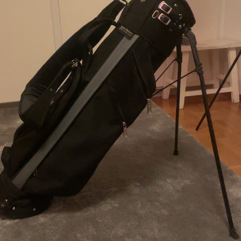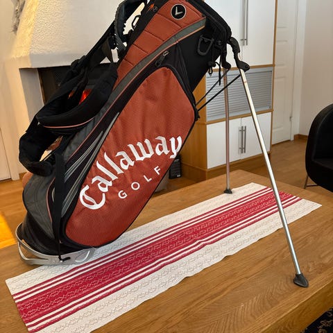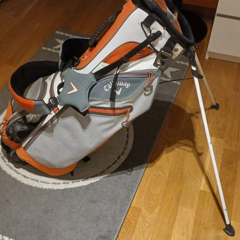 Callaway golfbag med integrerat stativ i svart och grå färg. Golfbagen har flera fack för förvaring och ett stativ som gör det möjligt att placera bagen upprätt på marken. Passar för att bära och organisera golfklubbor under spel.