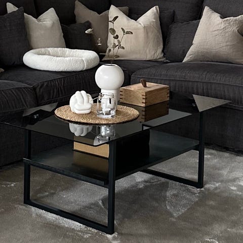 Soffbord i mörkglaskiva med två fötter i stål säljes.