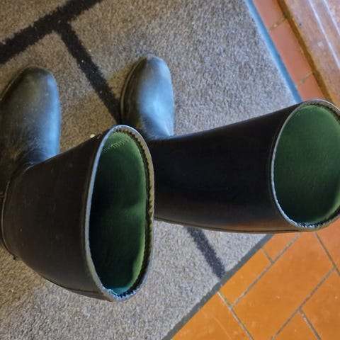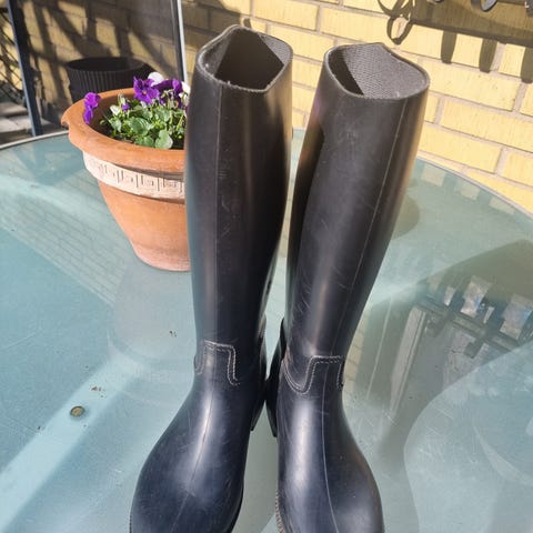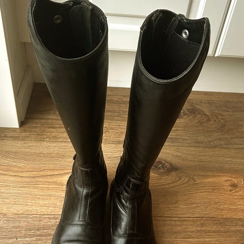 Ridstövlar i svart läder. Stövlarna är höga och har dragkedja baktill för enklare på- och avtagning. Använda och visar viss slitage.