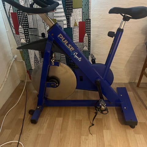 Bastant med tungt svänghjul. Pedaler och sits är inte original. Omkring 15 år gammal. Lätt ytrost på vissa ställen (se bilder). Inte använd på ett tag, kan behöva smörjas upp. Fungerar dock helt u.a.