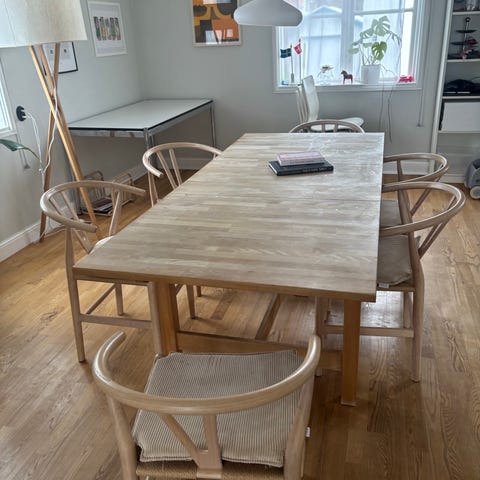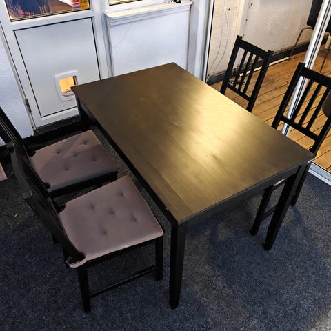 Tommaryd dinner table (70x130, 75 cm height) and 6 Lerhamn chairs, in black color. The table is in good condition with some scratches visible on the picture. The chairs have seen some use; but the fabric can be taken out and washed.