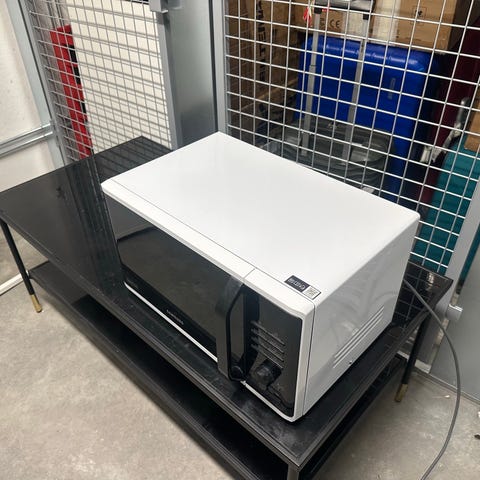 Siemens mikrovågsugn i vit färg. Utrustad med digital kontrollpanel och roterande tallrik inuti.