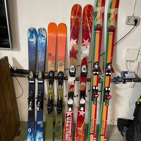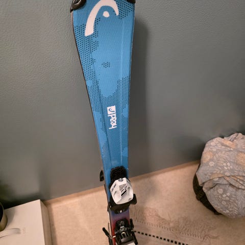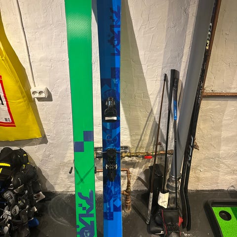 Twin-Tip med längd 107 cm i blå och gul färg. Väl använda och har en hel del repor på ovansidan. Framför allt efter att slagits ihop vid hoppande och skogsåkning. Belaget är bra, några repor. Nyvallade och längtar ut i backen igen!