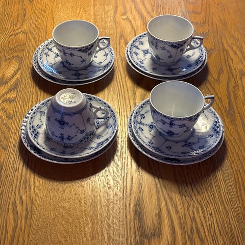 Royal Copenhagen Blå Blomst köksporslin med blå blomsterdekor på vit botten. Setet innehåller koppar, fat, tallrikar och serveringsfat i ljusstakar, gräddkanna, karaff, urna med lock. Designen är traditionell och passar för servering och dukning. 50 delar.