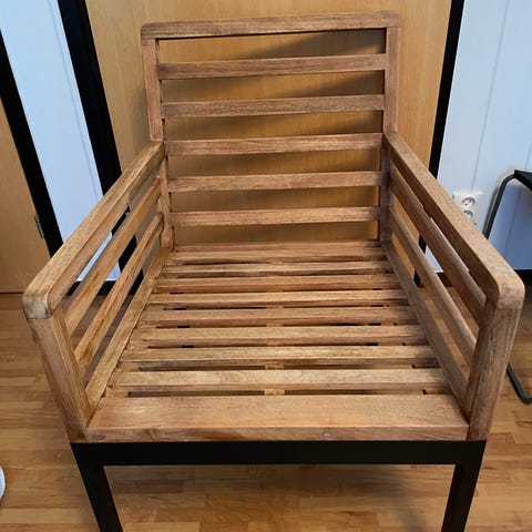 Två stolar och ett bord säljs pga flytt. Möblerna har stått ute under vintern och det finns behov av lite omsorg inför sommar säsongen. Dynor medföljer. Säljer även hörnsoffa Nämmarö i annan annons.