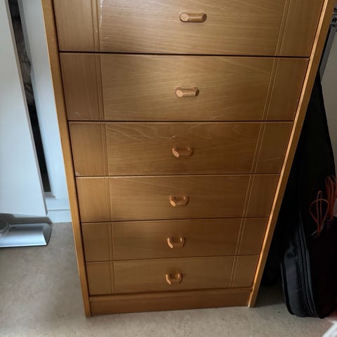 Furu byrå med 5 lådor. 90x46x42.