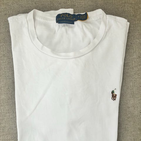 Ralph Lauren Polo tröja i storlek M för män. Tröjan är vit och tillverkad i bomull. Den har en kabelstickad design och rund halsringning.