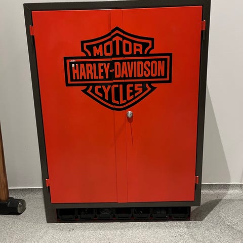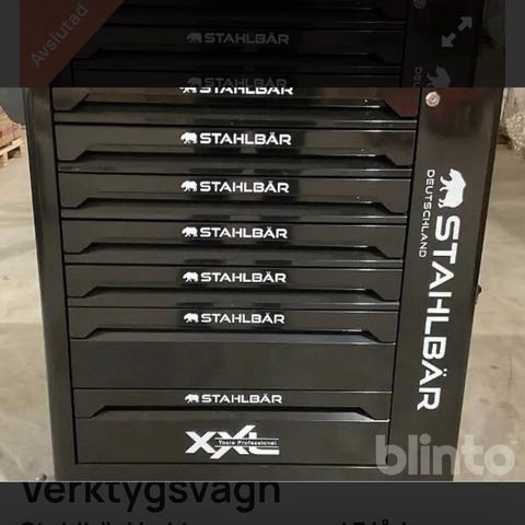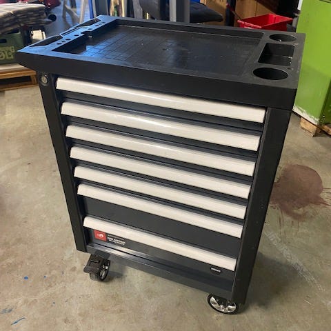 Verktygsvagn/skåp med sortimentlådor på baksidan.