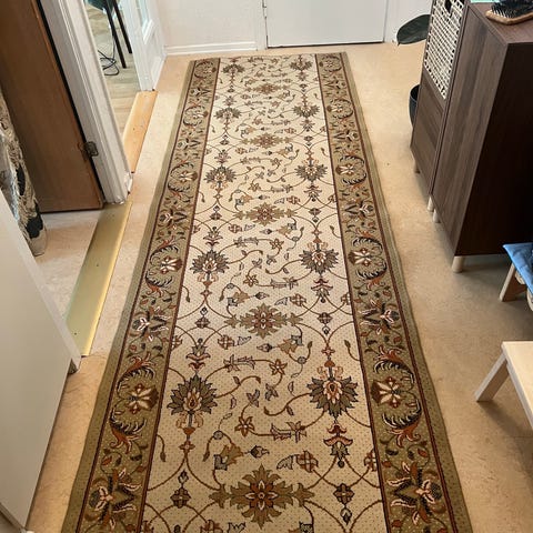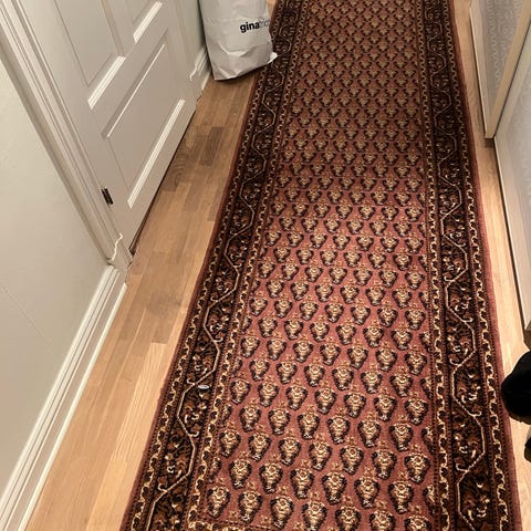 Hallmatta med detaljerat mönster i bruna och beige toner.