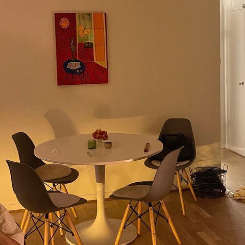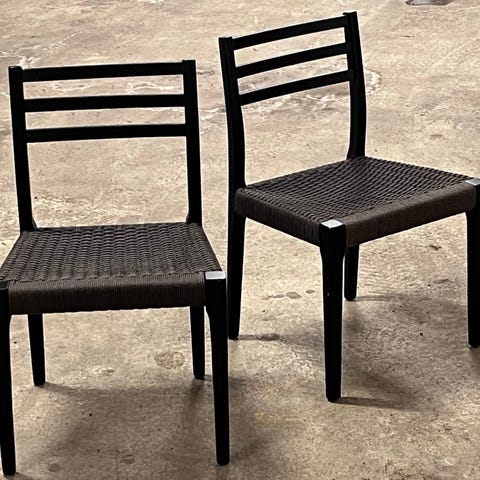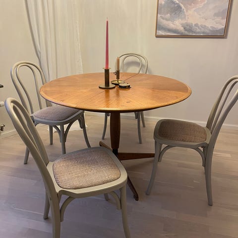 Det var fel färg för mig. Har testmålat under en stol, se bild. På en stol är det lite fabriksfel, med lite extra lack vid nedre spjälarna, se bild. Inget man tänker på om man inte tittar väldigt noga. Träets skiftningar gjorde att jag själv inte tänkte på det.