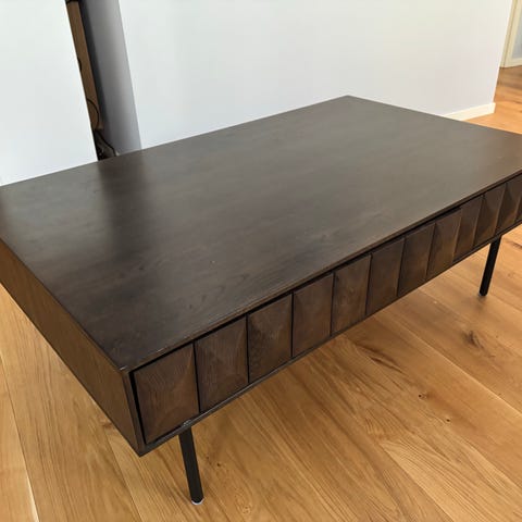 Avlångt soffbord tillverkat i trä med en underhylla för extra förvaring. Bordet har en slät yta och är avlångt med fyra ben som stödjer bordsskivan och hyllan. Det finns en mindre rödvinsfläck på bordsskivan.