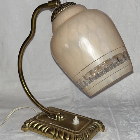 Bordslampa designad av Einar Bäckström från Malmö och är troligen tillverkad under 1940-50-talet. Lampan har en empirestil med stomme i mässing och lackerad, mörk plåt. Stämplad undertill med EB, Made in Sweden 6122.
