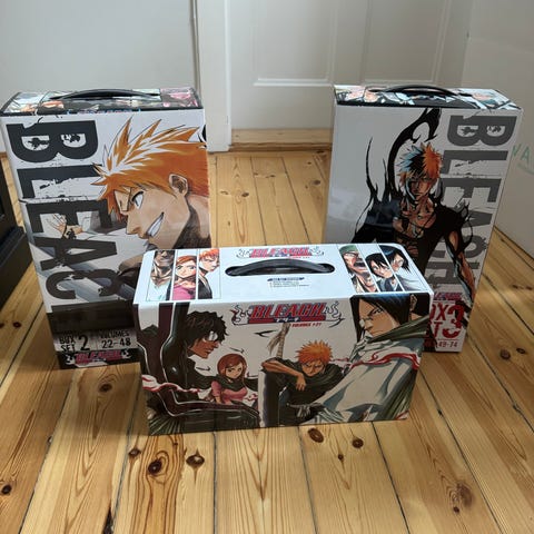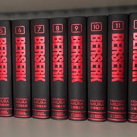 Berserk Deluxe Edition manga av Kentaro Miura. Innehåller samlade volymer i deluxeformat. Svart omslag med röd text.