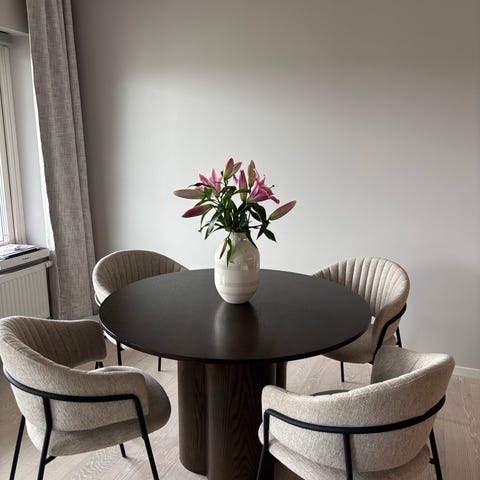 Stilrent matbord i ek – plats för 6 personer + 4 stolar