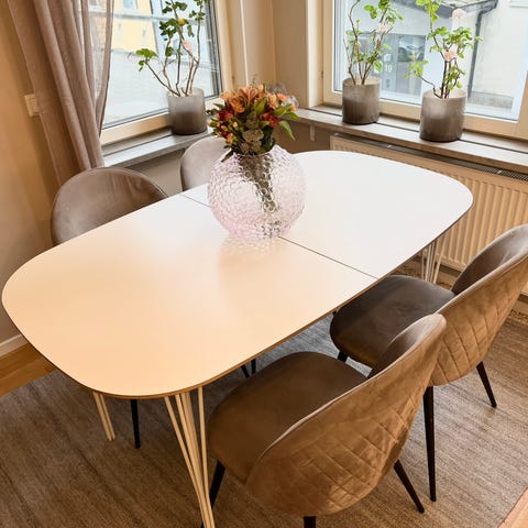 4 bekväma stolar ingår – har mindre fläckar som enkelt går bort vid rengöring.