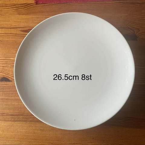 Säljer ett snyggt och enhetligt tallriksset i vitt porslin med fin struktur/mönster längs kanten. Passar både vardag och middagar. Säljs pga flytt.