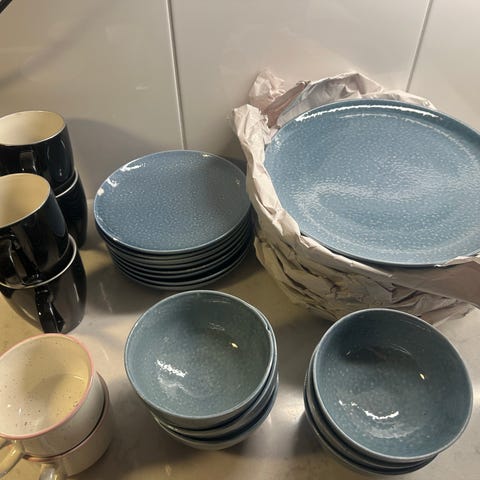 Allt är i bra skick. Det finns mindre ytliga skråmor på några tallrikar men inget som märks av. I botten på skålarna finns fina linjer/streck i glasyren (se bild) vilket är vanligt på porslin.