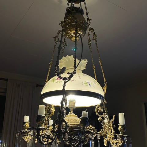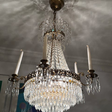 Jättefin takkrona i empirstil med 4 ljushållare. Troligtvis från 1800-talet. Väger endel.
