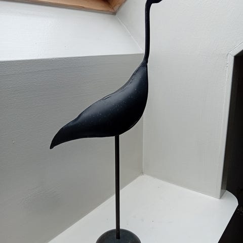 En trana i trä som står på en trästock i fint