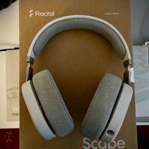Logitech hörlurar över örat med vit och blå färg. Hörlurarna har en justerbar huvudbygel och vadderade öronkuddar för komfort.