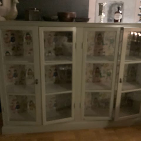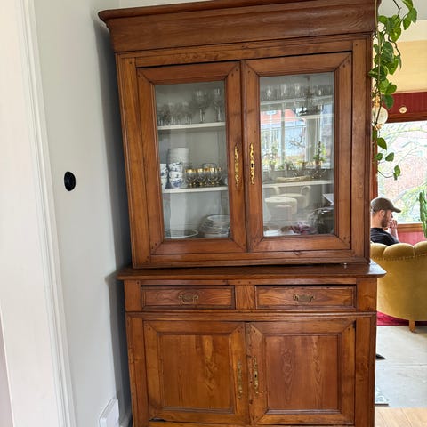 Vackert vitrinskåp i klassisk stil med böjda glaspartier.Skåpet står på smäckra ben och passar utmärkt för porslin, glas eller samlarföremål....