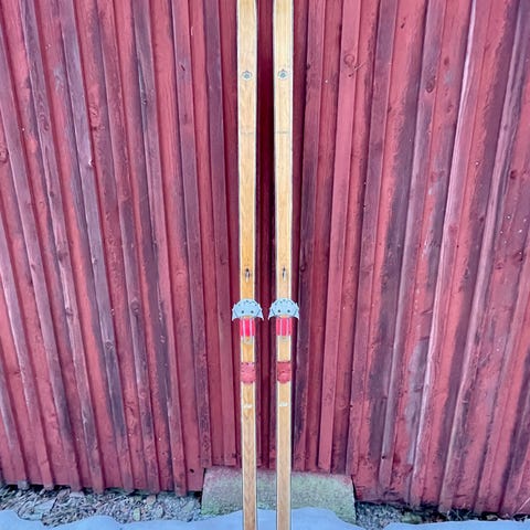 Äldre (60-tal) mycket fina träskidor med stålkant och bindning som går att fästa på två sätt. 7,5 vm breda, 220cm långa.