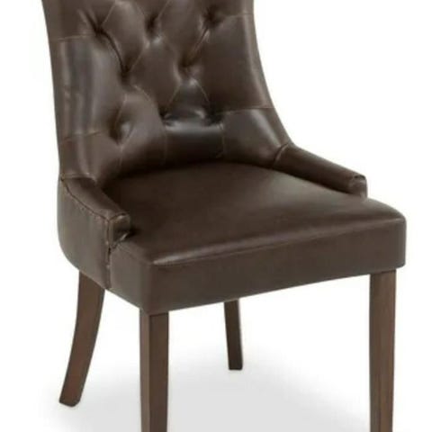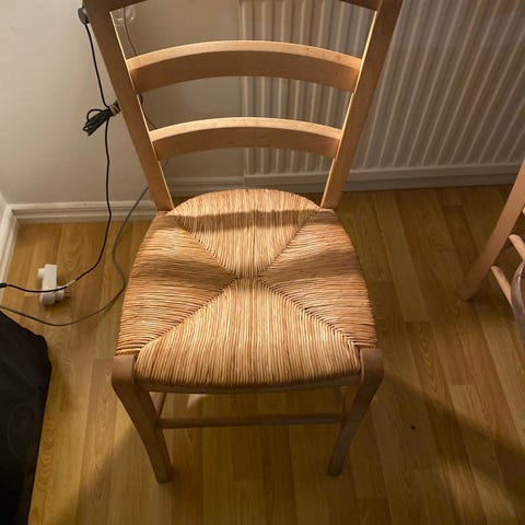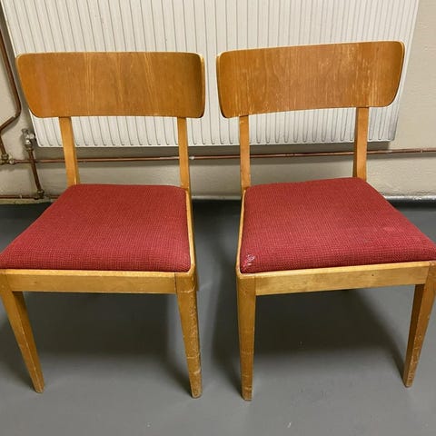 Rejäla stolar i ek med skinnklädsel. Klädsel har börjat släppa från sitsen men går säkert att sätta på nytt om man lossar nitarna, se bild. Annars mycket fina.