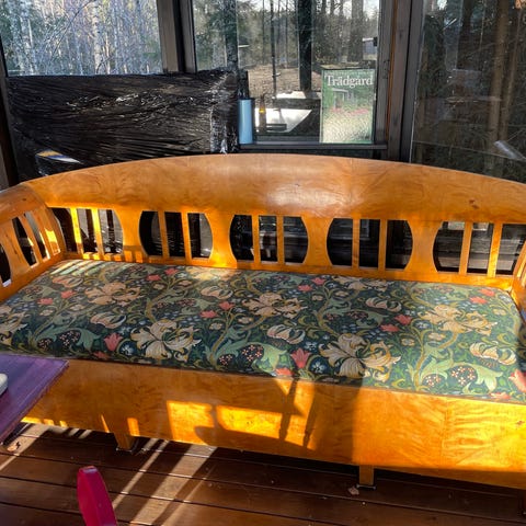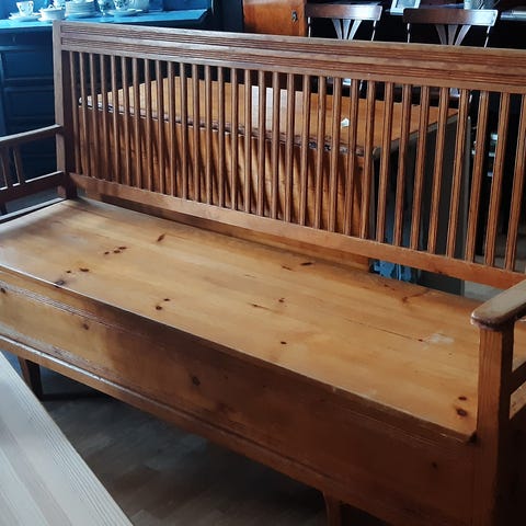 Med sina ståtliga 185 cm så fyller denna bänk sitt syfte i stugan, med osedvanligt stor kista får mycket plats smidigt samtidigt som den kan användas som utdragssäng. Kanske bara inte samtidigt som det förvaras saker där i bara...