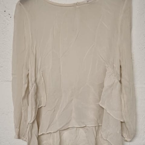 Ljusbeige blus med långa, vida ärmar och rund halsringning. Blusen har en ledig passform. Storlek M
