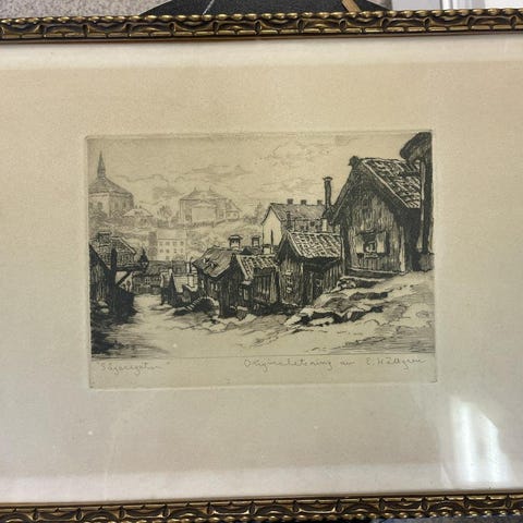 Originaletsning av E. Hällgren med motiv från Roslagsgatan i Stockholm. Stilrent svartvitt motiv med charmig stadsmiljö från förr.