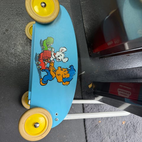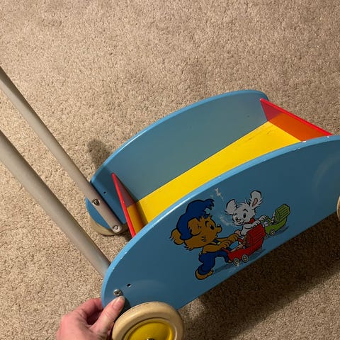 Lära gå vagn för små barn i färgerna blå, röd och gul.