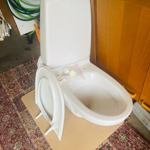 WC-stol i vitt med spolknapp på cisternen och toalettstolssits. Passar för standardinstallation i badrum. Märke: Ifö.