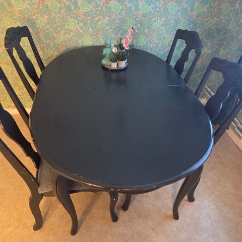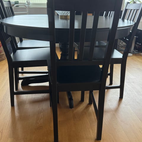 Stabilt runt bord med stabila 4 stolar.Förstora gärna bilderna Stolarna nyligen omklädda. Endast avhämtning i Västervik.kontant betalning