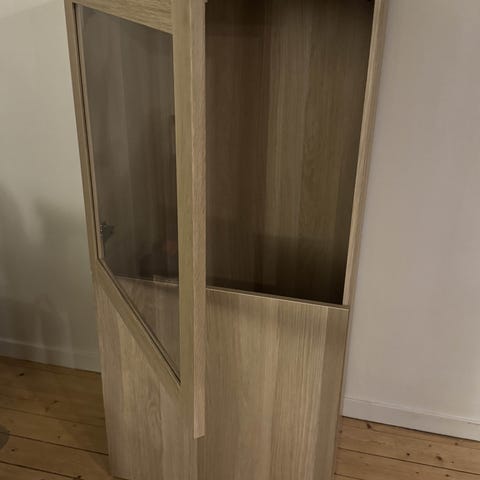Ett vitrinskåp med hyllplan i glas. Två stycken Bestå skåp.