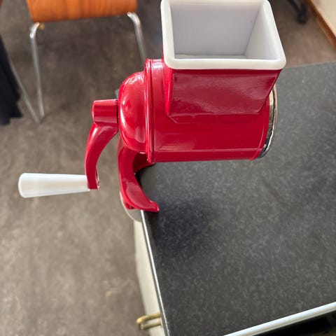 Antik handvevad rivjärn i metall och trä. Utrustad med en vev och en klämma för fastsättning på bord eller bänk. Används för rivning av grönsaker eller ost i köket.