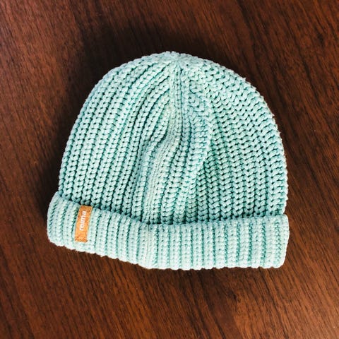 Den ena är grön glimrande med en dekorativ detalj framtill, medan den andra är grå och ribbstickad. (Kanske mer för pojke?)