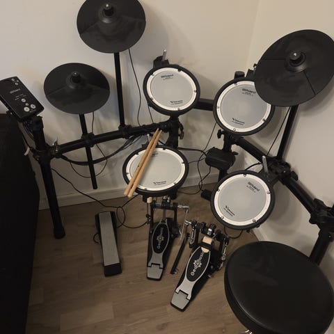Roland V-Drums elektroniskt trumset med flera trumplattor och cymbaler. Inkluderar trumtriggers, pedaler och kontrollenhet för ljudinställningar. Passar för inomhusbruk och övning av trumspel.