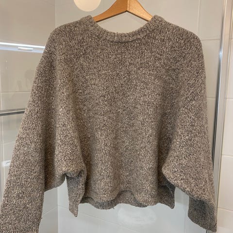 Brun stickad tröja med hög krage och vida ärmar. Tröjan har en kortare, croppad modell.