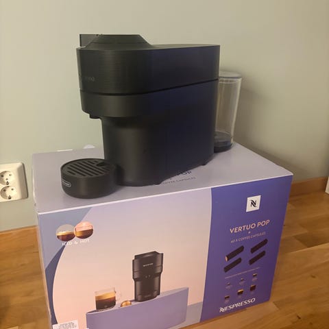 Nespresso Vertuo Next kaffemaskin i svart färg. Maskinen är avsedd för att brygga kaffe med kapslar och har en kompakt design som passar i kök och kontor. Den är tillverkad av plast och metallmaterial och är anpassad för hushållsbruk.