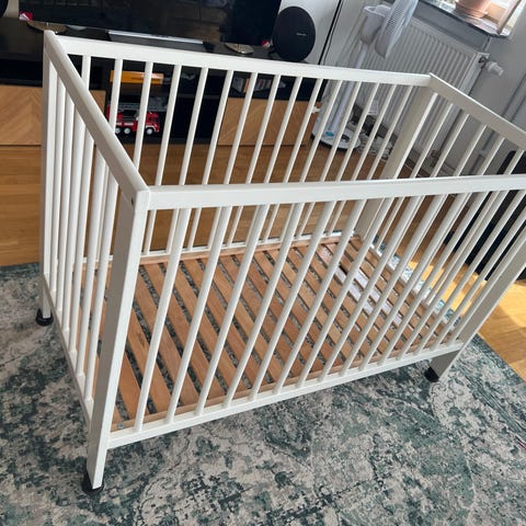 IKEA spjälsäng i vitt med integrerad förvaringslåda under sängen. Tillverkad i trämaterial och designad för barn. Sängen har spjälor runt om och är anpassad för småbarn. Finns lite små repor kan finnas klistermärke lim kvar inget en våtservetter inte kan ta bort. Madrass ingår ej
